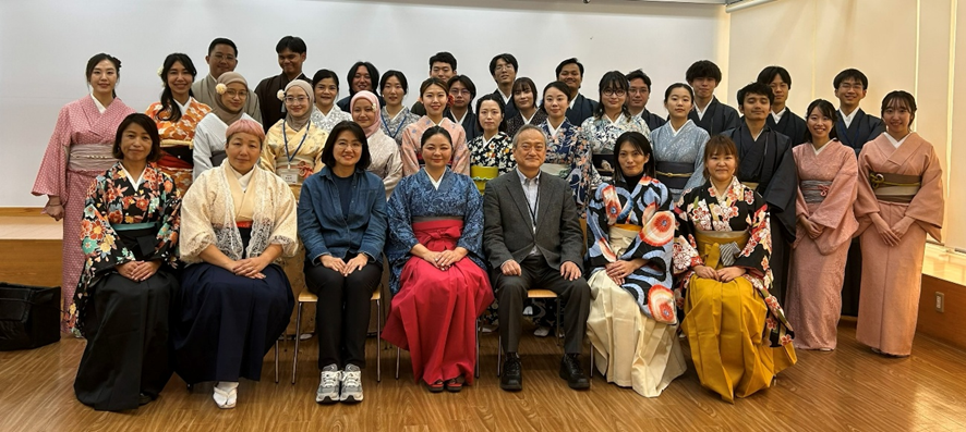 2025年11月20日、きものの着付け体験や各国の伝統衣装の紹介を通じて、異文化理解を深める国際交流会を開催しました。本活動は、世界展開力強化事業 (CAMPUS-Asia6)との連携のもと実施され、本学の多文化共修活動に参加する日本人学生とCAMPUS-Asia6の留学生、さらに韓国教員大学校からの短期留学生を含む計27名が参加し、きものを通じて交流を深めました。