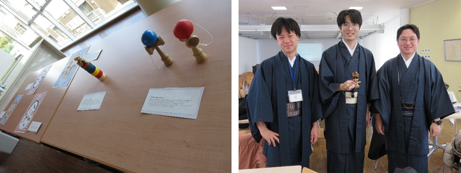 着付けの待ち時間には、日本の昔ながらの遊びを紹介しました。一番人気はけん玉で、笑顔と歓声があふれました。実際にきものを身に着けると、各自の立ち姿や歩き方に変化があり、「背筋が伸びる感じがする」「自信がもてた」という感想も寄せられました。日本人でも初めてきものを着用したという学生もいました。