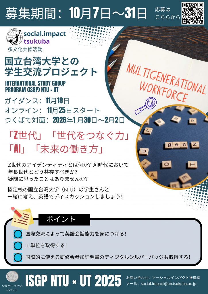 2025年度は「Z世代」「世代をつなぐ力」「AI」「未来の働き方」をテーマとして、NTUとUTの学生でつくった少人数グループで複数回オンラインディスカッションを行った後、NTUの学生が筑波大学を訪問して、対面で最終ディスカッション及び成果報告を実施します。