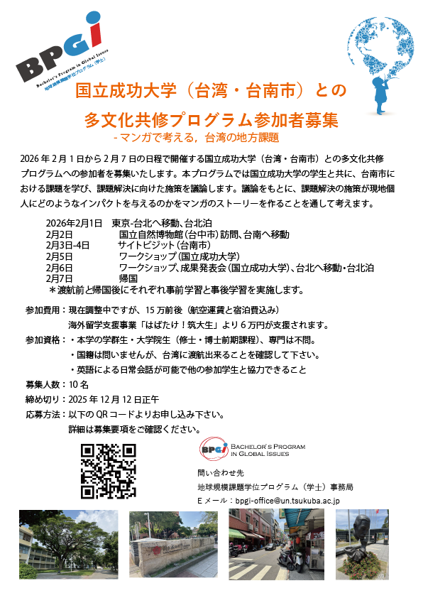 筑波大学地球規模課題学位プログラム(BPGI)では、2026年2月1日から2月7日に実施する、国立成功大学(台湾・台南市)との多文化共修プログラムの参加学生を募集します。