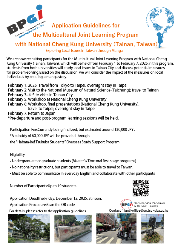 The Bachelor’s Program in Global Issues (BPGI), University of Tsukuba, is now recruiting participants for the Multicultural Joint Learning Program with National Cheng Kung University (NCKU), Tainan, Taiwan. In this program, students from both universities will explore local issues in Tainan City, exchange ideas for possible solutions, and visualize the impact of these solutions on individuals by creating a manga-based storyline.