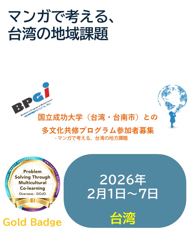 The Bachelor’s Program in Global Issues (BPGI), University of Tsukuba, is now recruiting participants for the Multicultural Joint Learning Program with National Cheng Kung University (NCKU), Tainan, Taiwan. In this program, students from both universities will explore local issues in Tainan City, exchange ideas for possible solutions, and visualize the impact of these solutions on individuals by creating a manga-based storyline.