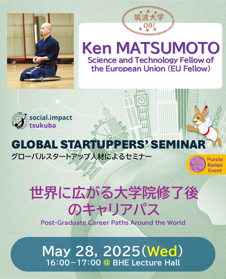 Are you considering taking your career beyond Japan after graduate school? Join us for the upcoming Global Start-upper’s Seminar, where we welcome Ken Matsumoto, EU Science and Technology Fellow, to share his unique journey and global career path.